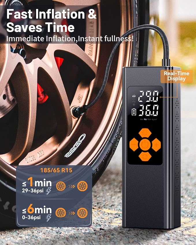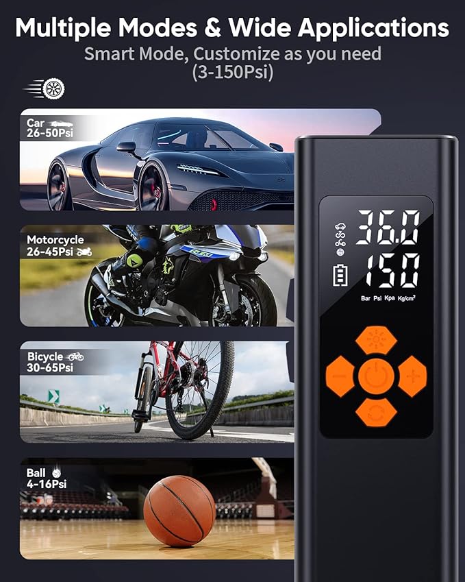 Inflagem Rápida e Precisa: Pressão máxima de até 150 PSI, capaz de encher pneus de carros, motos, bicicletas e até bolas em poucos minutos.
